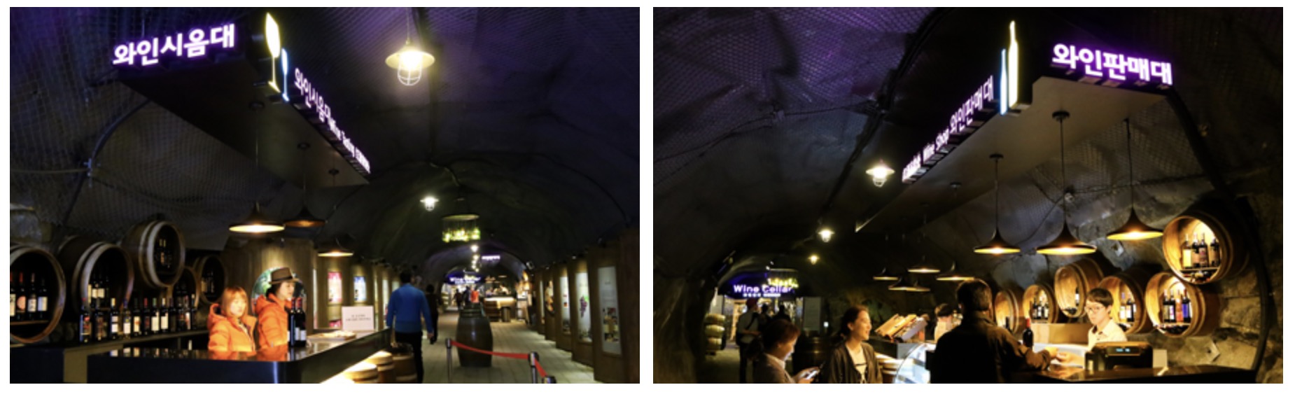 광명동굴에는 194m의 와인동굴이 있습니다. 연중 12도로 일정한 온도를 유지하는 이곳에서 대한민국 국산와인을 만날 수 있습니다. 전국 170여 종의 국산 와인이 판매되고 있습니다. 2024년 와인 시음 행사는 별도로 홈페이지에 고지될 예정입니다.
