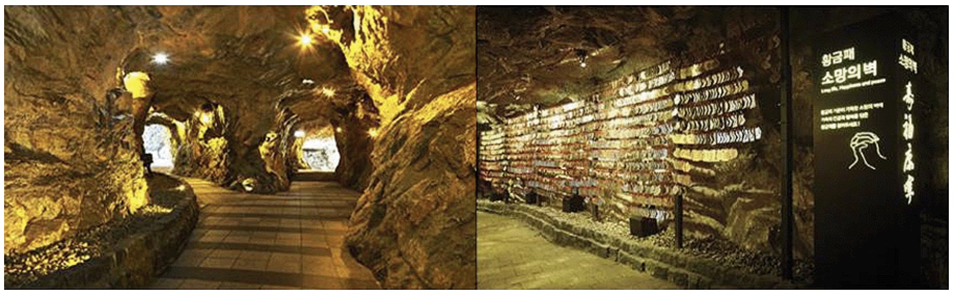 금, 은, 구리 등 귀금속이 채굴되었던 광명동굴의 오랜 역사를 갖고 있습니다. 황금길은 광명동굴의 역사를 직접 체험할 수 있는 길로 소망을 적는 소망벽이 있습니다. 구입한 황금패는 광명동굴 황금길에 1년 동안 전시되어 행복과 염원을 함께 기원합니다.